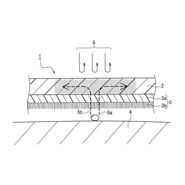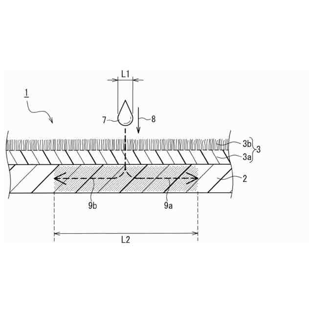 図3は本発明の一実施形態の多層構造編地の裏面(肌側面)に水滴を落としたときの水の表面への吸水拡散性を示す模式的概念図である。
