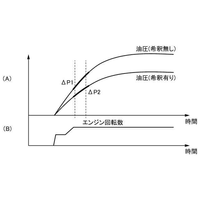 始動時のエンジンオイル圧力上昇の傾きを前記第1係数及び前記第2係数で補正し、補正した結果が所定の閾値を下回る場合か否かで前記エンジン内におけるエンジンオイルの燃料希釈発生を判断し、