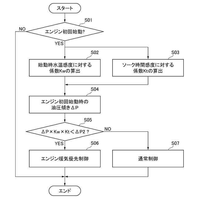 【解決手段】始動時冷却水温度に関する第1係数と、始動前のソーク時間に関する第2係数とを算出し、始動時のエンジンオイル圧力上昇の傾きを第1係数及び第2係数で補正し、補正した結果が所定の閾値を下回る場合か否かでエンジン内の燃料希釈発生を判断し、燃料燃料希釈が発生したと判断すると、エンジンの暖機を促進する暖気優先制御を行う。