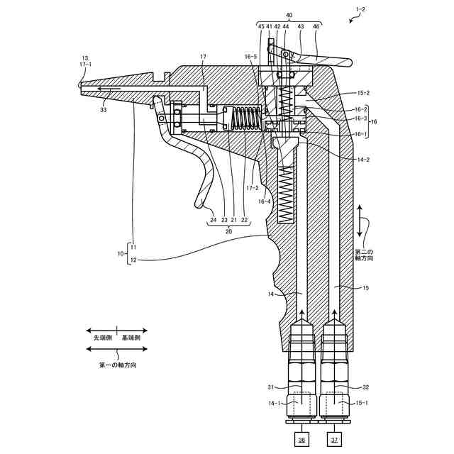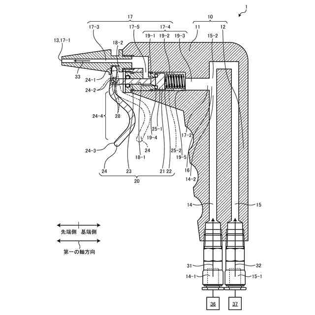 該弁体は、該噴出流路の軸方向において、該噴出口から該混合流体を噴出しない状態とする噴出停止位置と、該噴出口から噴出される該混合流体の量を最大とする最大噴出位置と、の間を移動可能なように該噴出流路内に配設され、弾性体であり、伸縮方向が該噴出流路の軸方向に沿うように該噴出流路内に配設され、該弁体を該噴出停止位置へと付勢する弁体付勢部をさらに備え、該弁体付勢部はコイルバネを含み、該伸縮方向においてコイルの内周径が異なる複数の領域を有することで、該気体と該液体の混合を促進し、該混合促進部としても機能してもよい。