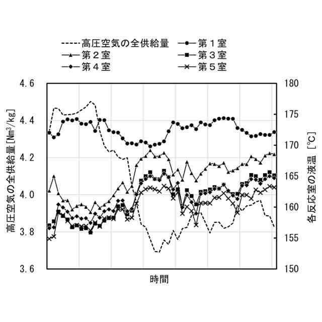 高圧空気の全供給量および各反応室の液温の経時変化を示すグラフである。
