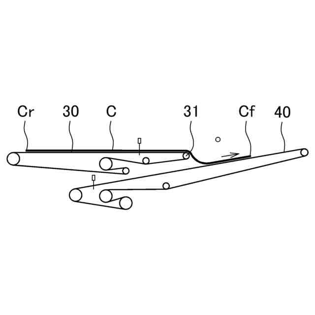 第2態様によれば、第1コンベアの下流端と第2コンベアの受取領域とを接近させることで、布類の第1コンベアから第2コンベアへの移乗が円滑となり、布類にシワやめくれなどが生じることを抑制できる。また、第1コンベアの下流端と第2コンベアの受取領域とを離隔させることで、それらの間を布類が通過する際に第1コンベアが布類に干渉することを抑制できる。