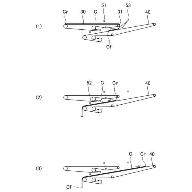 第9態様によれば、第1コンベアの下流端と第2コンベアの受取領域とが離隔しているため、これらの間に布類が通過するのに十分な隙間を確保でき、第2コンベアで布類を正方向に搬送する際に第1コンベアが布類に干渉することを抑制できる。