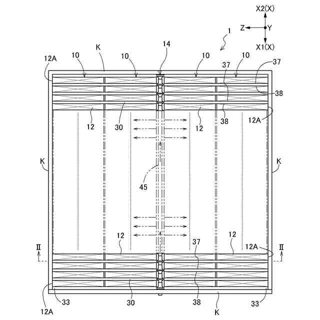 【解決手段】温度調節器30は、第1方向Xに沿って互いに隣り合う2つのセル12の側面の間に設けられ、第1方向Xに沿って互いに対向する第1平板部37及び第2平板部38と、第1平板部37及び第2平板部38の夫々を接続する複数の接続壁80と、第1平板部37と第2平板部38とで挟まれた領域を第1方向Xに区画する区画壁60と、複数の接続壁80を第1方向Xと交差する第2方向Yに沿って繋げるように配置された板状の断熱材90と、を備え、断熱材90は、区画壁60と当接可能な位置に第1方向Xに沿って突出する複数の突出部70を有する。