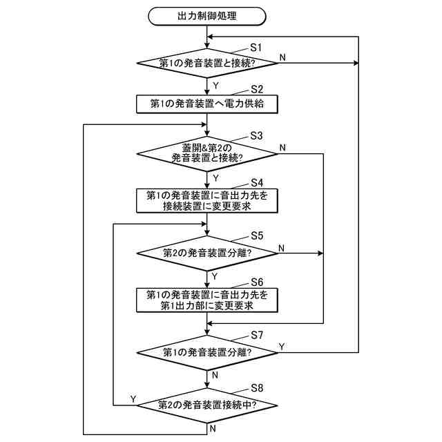 前記第1接続部に自機が接続しており、かつ前記第2接続部が前記第2の発音装置と接続している場合に、前記第1接続部へ前記音データを出力させるための情報を前記第1の発音装置に対して出力する伝達部を備える、