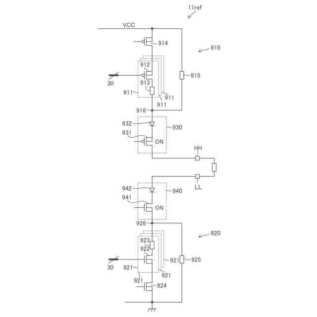 以下、本開示の実施形態の例を、図面を参照して具体的に説明する。参照される各図において、同一の部分には同一の符号を付し、同一の部分に関する重複する説明を原則として省略する。尚、本明細書では、記述の簡略化上、情報、信号、物理量、機能部、回路、素子又は部品等を参照する記号又は符号を記すことによって、該記号又は符号に対応する情報、信号、物理量、機能部、回路、素子又は部品等の名称を省略又は略記することがある。例えば、後述の“MH”によって参照されるハイサイドトランジスタは(図7参照)、ハイサイドトランジスタMHと表記されることもあるし、トランジスタMHと略記されることもあり得るが、それらは全て同じものを指す。