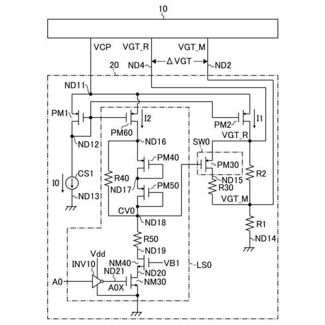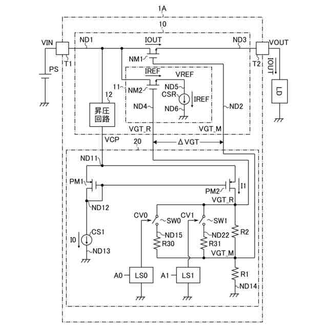 を含み、前記第1スイッチ素子の切り替えを行うことにより、前記第2トランジスタのゲート電圧と、前記第1トランジスタのゲート電圧との電圧差を調整する第2回路と