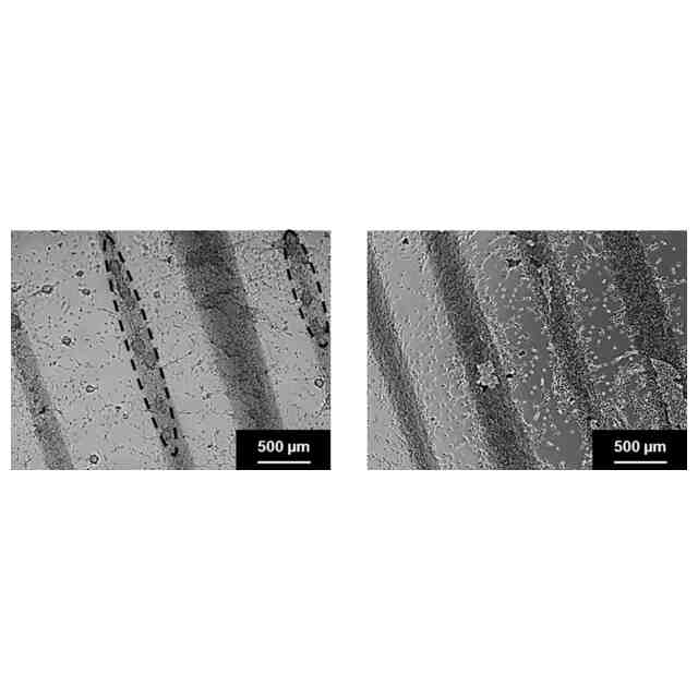 該器具を用いることにより、成膜条件の異なる非晶質炭素膜が格子状に隣接した近接領域に成膜され、異なる炭素膜上であることを除いてはほぼ同一培養環境下での培養細胞間の静的な差異を同時に観察することが可能となった。これに加えて、発明者らは、該器具における培養細胞を経時的に観察することにより、細胞が接着および/又は増殖を繰り返す過程において、より好ましい膜環境を求めて移動していく動的な性状を見出すに至った。これにより、いずれの成膜条件に係る非晶質炭素膜表面が、対象となる細胞にとって、接着性及び/又は増殖性等においてより好適な環境であるか、をより明確に判定することが出来る様になった。
