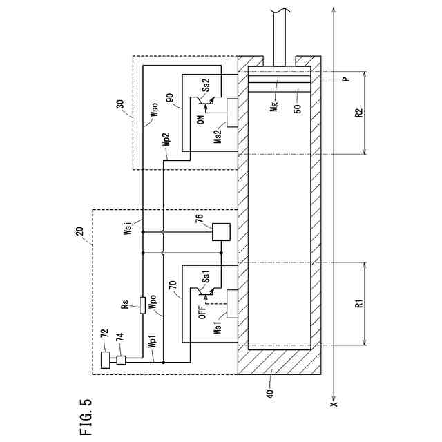 図5は、第1センサおよび第2センサの他の構成例と、ピストン位置に応じた第1センサおよび第2センサへの電力供給とを説明するための図である。