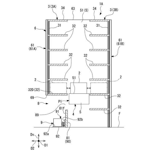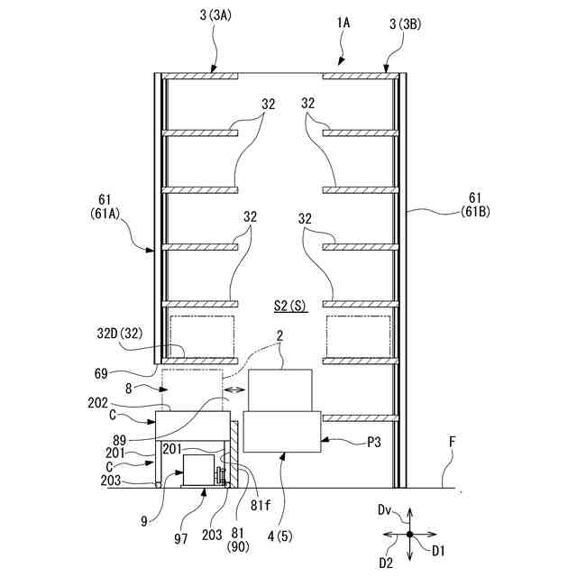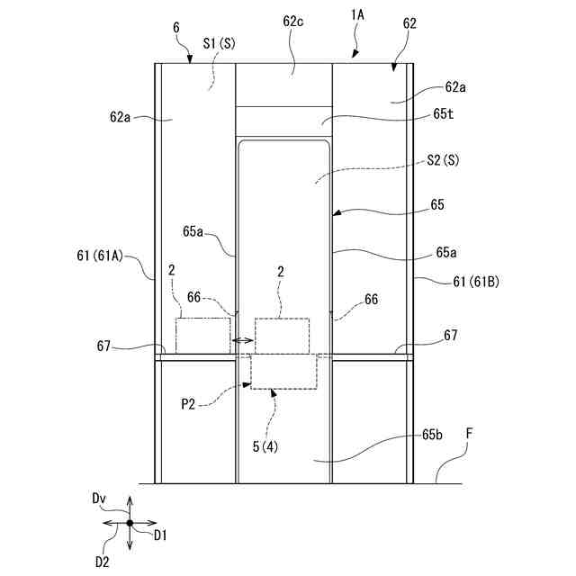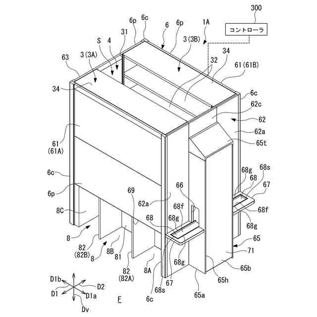 また、搬送器における、収納棚および搬送機構間での収容ボックスの出し入れ、連通開口を通した収納空間およびカートの間での収容ボックスの出し入れの方向は、いずれも水平第二方向である。このため、収納棚および搬送機構間での収容ボックスの出し入れ、および、連通開口を通した収納空間およびカートの間での収容ボックスの出し入れ、を行うための搬送器の構成をシンプルなものとすることができる。