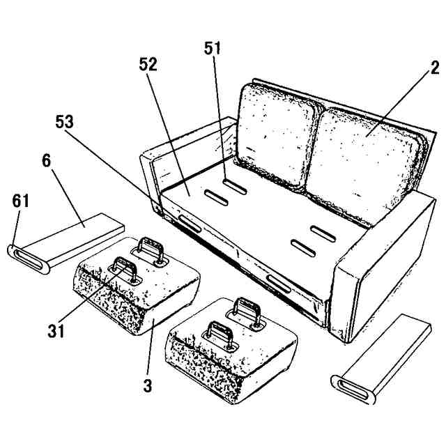 クッション3を取り外したソファー1の構成分解図を図2示す。クッション3は下部にU字型把持部31を有している。フレーム5は座面52に篏合溝51と側面に係止口53を有している。係止部6は端部に把手61を有している。