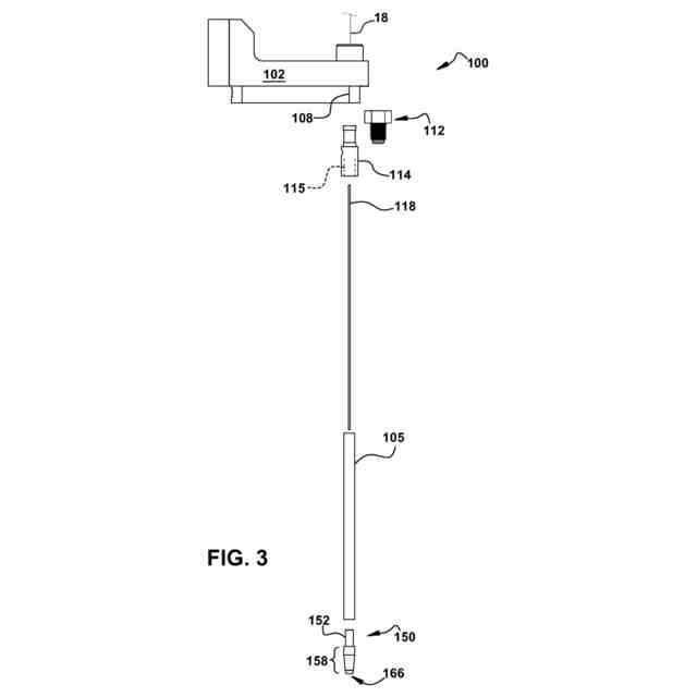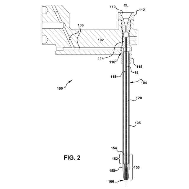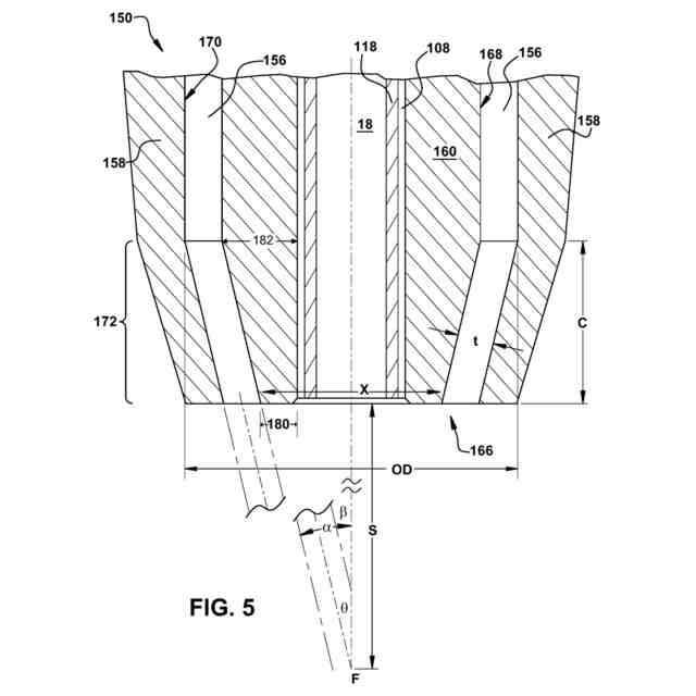公開番号2025137442 公報種別公開特許公報(A) 公開日2025-09-19 出願番号2025027753 出願日2025-02-25 発明の名称放電加工システムの高速穴あけ用スルーフラッシュガイド 出願人ジーイー・ベルノバ・テクノロジー・ゲーエムベーハー,GE Vernova Technology GmbH 代理人個人,弁理士法人NIP&SBPJ国際特許事務所 主分類B23H 9/14 20060101AFI20250911BHJP(工作機械;他に分類されない金属加工) 要約【課題】放電加工システムの高速穴あけ用スルーフラッシュガイドを提供する。 【解決手段】スルーフラッシュガイド(100)は、放電加工装置(10)に取り付けられたマスト(12)から作業台に向かって延びるクイル(104)を有する。(14)放電加工装置の電極(18)は、クイルを貫通して作業台まで延びている。クイルは、電極(18)の周囲に誘電流体通路を含む。クイル上のガイド先端(150)が誘電流体を受け取り、ガイド先端の先端からスタンドオフ距離(S)だけ離れた焦点(F)に誘電流体を導く。 【選択図】図5 特許請求の範囲【請求項1】 高速穴あけ放電加工用のスルーフラッシュガイド(100)であって、 ガイド本体(102)と、 中空本体(105)を有するクイル(104)であって、前記クイルは、第1の端部と、前記第1の端部とは反対側の第2の端部とを有し、前記第1の端部は、前記ガイド本体(102)に取り付けられ、前記放電加工装置の電極(18)を受け入れて搬送するように構成され、前記クイル(104)は、前記クイルの前記第1の端部から前記クイルの前記第2の端部まで誘電流体を受け入れて搬送するように構成される、前記クイル(104)と 前記クイルの前記第2の端部に設けられたガイド先端(150)と、 を含み、 前記クイル(104)と前記ガイド先端(150)とが共通中心線(CL)を有し、 前記ガイド先端が、前記共通中心線に沿って画定された前記ガイド先端の電極通路(108)と、前記電極通路の周囲に画定された前記ガイド先端(150)の誘電体流体通路を提供する下部流路(156)とを含み、 前記ガイド先端の漏斗部分(172)において、前記下部流路(156)は、前記ガイド先端の出口端部(166)からスタンドオフ距離(S)離れた位置にある焦点(F)に向けて誘電流体を導くように構成される、スルーフラッシュガイド。 続きを表示(約 1,200 文字)【請求項2】 前記ガイド先端(150)が、内壁(170)を有する主部分(158)と、内側本体(160)とを有し、前記ガイド先端の前記電極通路(108)が、前記内側本体の中心に沿って画定され、前記ガイド先端の前記誘電流体通路を提供する前記下部流路(156)が、前記内側本体(160)の外壁(168)と前記主部分(158)の前記内壁(170)との間に画定される、請求項1に記載のスルーフラッシュガイド。 【請求項3】 前記漏斗部分(172)が、前記ガイド先端の前記出口端部(166)に向かう方向において、前記ガイド先端の前記出口端部(166)からシフト距離(C)離れて開始し、前記主部分(158)の前記内壁(170)の傾斜が、前記シフト距離において、前記ガイド先端と前記クイルの前記共通中心線(CL)に対して第1の角度(α)へ変化する、請求項2に記載のスルーフラッシュガイド。 【請求項4】 前記漏斗部分(172)が、前記ガイド先端の前記出口端部(166)に向かう方向において、前記ガイド先端の前記出口端部(166)から離れるシフト距離(C)を開始し、前記内側本体(160)の前記外壁(168)の傾斜が、前記シフト距離において、前記ガイド先端の前記中心線に対して第2の角度(β)へ変化する、請求項3に記載のスルーフラッシュガイド。 【請求項5】 前記第2の角度と前記第1の角度が等しい、請求項4に記載のスルーフラッシュガイド。 【請求項6】 前記ガイド先端の前記誘電流体通路を提供する前記下部流路(156)が前記漏斗部分において錐形である、請求項1に記載のスルーフラッシュガイド。 【請求項7】 前記ガイド先端の前記誘電流体通路を提供する前記下部流路(156)が、前記ガイド先端(150)の前記出口端部(166)に向かう方向において、前記ガイド先端の前記漏斗部分(172)における前記クイルと前記ガイド先端の前記共通中心線(CL)に対して傾斜する、請求項1に記載のスルーフラッシュガイド。 【請求項8】 前記クイル(104)内であって、前記クイル(104)と同心の電極ガイドチューブ(118)をさらに含み、前記電極ガイドチューブが電極(18)を受容するように構成される、請求項1に記載のスルーフラッシュガイド。 【請求項9】 前記ガイド本体(102)が、前記放電加工装置(10)に取り付けられるように構成される、請求項1に記載のスルーフラッシュガイド。 【請求項10】 前記ガイド本体(102)が、前記放電加工装置に取り付けるように構成された取付端部と、前記取付端部の反対側の遠位端部とを含む、請求項1に記載のスルーフラッシュガイド。 (【請求項11】以降は省略されています) 発明の詳細な説明【技術分野】 【0001】 本開示は、一般に、放電加工(「EDM:electrical discharge machining」)システムに関し、特に、そのようなシステムによる高速穴あけ(「FHD:fast hole drilling」)に関し、より詳細には、FHDの性能を改善するためのスルーフラッシュガイド(through flush guide:貫通フラッシング案内部品)に関する。 続き