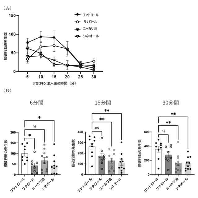 クロロキンを皮膚に皮内投与することで惹起されるマウスの掻破行動が、空気中のリナロール、シネオール、又はユーカリ油に反応して少なくなったことを示す図である。(A)は、経過時間に対して5分間の掻破行動の発生数をプロットしたグラフであり、(B)は、6分間、15分間、30分間の掻破行動の発生数の累計を示すグラフである。
