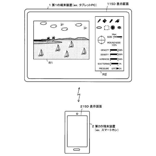 【解決手段】 第1の端末装置1と第2の端末装置2とが通信可能に接続されて構成され、第1の端末装置1の表示デバイスの表示画面115Dが描画エリア専用とされ、第2の端末装置2の表示デバイスの表示画面215Dが指示入力エリア専用とされる。そして、第1の端末装置1では、第2の端末装置2からの指示情報に応じると共に、第1の位置検出センサを通じて受け付ける描画操作入力に応じて第1の表示デバイスの表示画面115Dに設けられる描画エリアに描画が行われる。