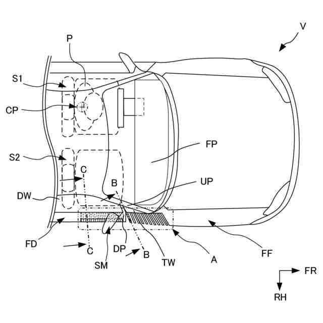 本実施形態においては、車両Vには、車両進行方向を向いたときの左側に運転席S1が設けられ、車両進行方向を向いたときの車幅方向右方外側に車体構造10が設けられている場合について説明する。
