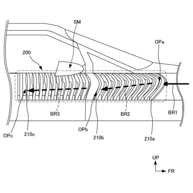 本発明の第1の実施形態に係る車体構造における走行風の流れを示す車幅方向から見た側面図である。