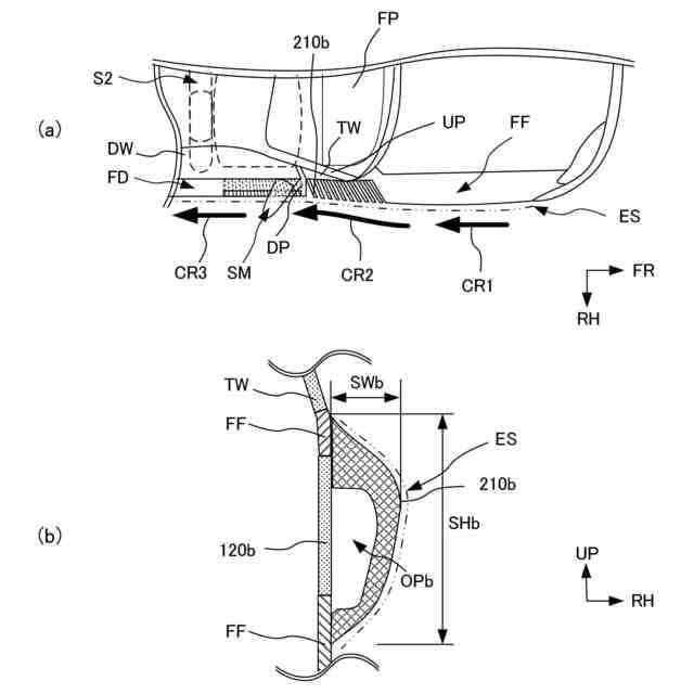 【解決手段】車両Vの車幅方向外側において、フロントドア部FDにおけるドアウインドガラス部DWの底辺BLよりも車両下側に開口され、車両Vの運転者Pが着座する運転席S1からの車幅方向下部外側の視認範囲を拡張する側方視認窓部100と、側方視認窓部100の車幅方向外側には、車両前後方向を板厚方向とし車両上下方向に延在する辺SHおよび車幅方向に向かって延在する辺SWを有し、車両前後方向に向かって貫通している通風開口部OPが形成されているフィン210が、相互に隙間SPを有し隣接して複数設けられているフェンダーフィン部200を備えている。