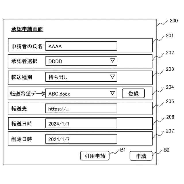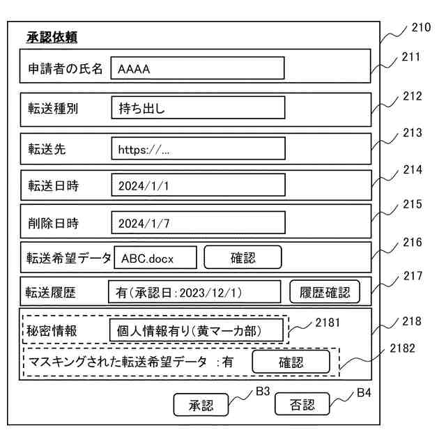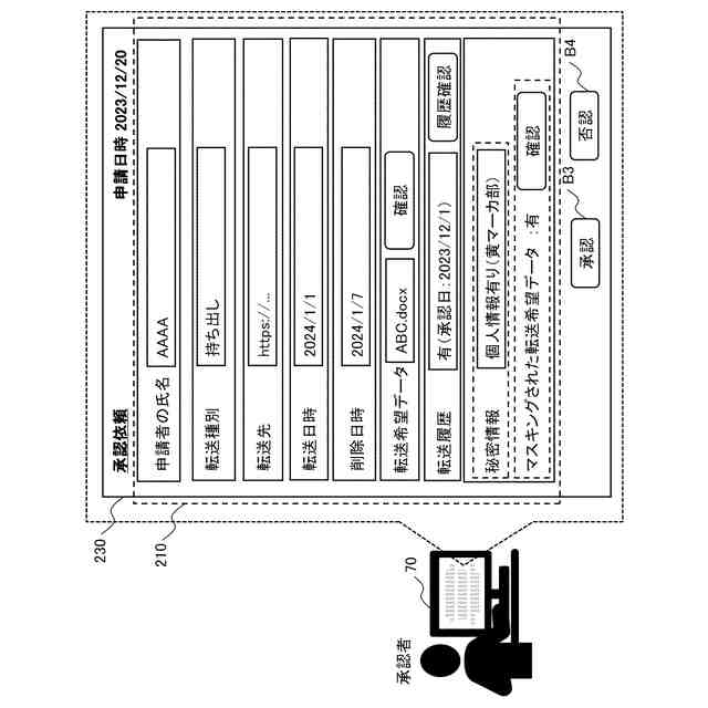 しかしながら、業務の都合で、データの転送が必要になる場合がある。このような場合に、情報漏洩を防ぎつつデータの持ち出しを可能にするための技術が、特許文献1に開示されている。特許文献1の情報処理システムは、利用者からファイルの持ち出しの承認依頼があると、ファイル名や持ち出し先の情報を含む承認管理画面を管理者端末に表示させる。管理者端末を操作する承認者は、承認管理画面を確認し、承認申請の承認または否認を行う。情報処理システムは、承認申請が承認された場合に、データ持ち出しのための処理を行う。