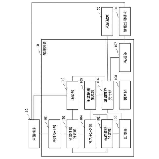 【解決手段】 転送希望データの転送を求める承認申請の入力を受け付ける申請受付部と、過去に転送された転送データの転送履歴が含まれる転送管理情報を用いて、前記転送希望データの転送履歴があるか否かを特定する転送履歴特定部と、前記転送希望データに秘密情報が含まれるか否かを特定する秘密情報特定部と、前記承認申請、前記転送履歴の特定結果、および前記秘密情報の特定結果を含む承認依頼を生成する承認依頼生成部と、承認者が操作する承認端末に前記承認依頼を送信する送信部と、を備える管理装置とする。