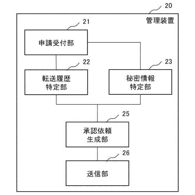 前記承認申請、前記転送履歴の特定結果、および前記秘密情報の特定結果を含む承認依頼を生成する承認依頼生成手段と、