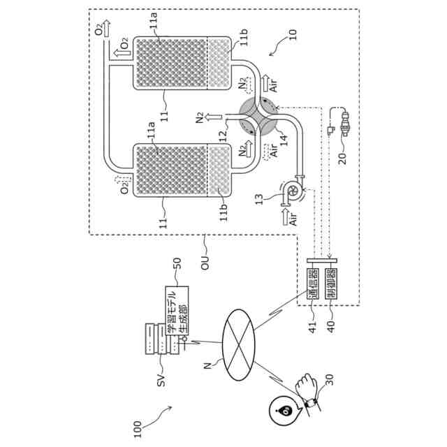 前記血中の酸素濃度と、前記空気中の酸素濃度との相関を、機械学習して得られる学習モデルとして生成する学習モデル生成部