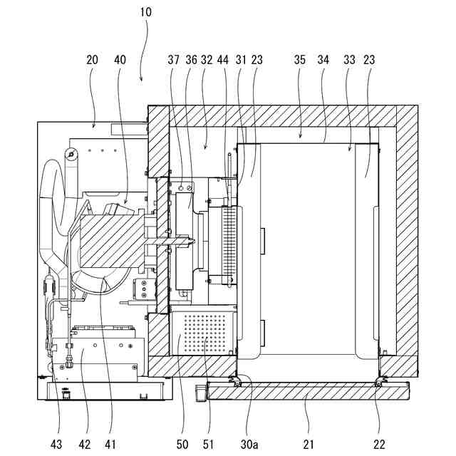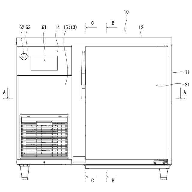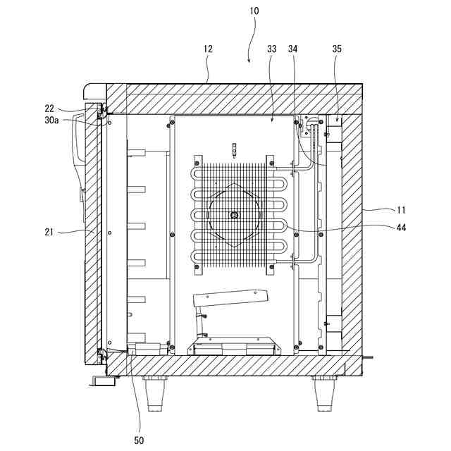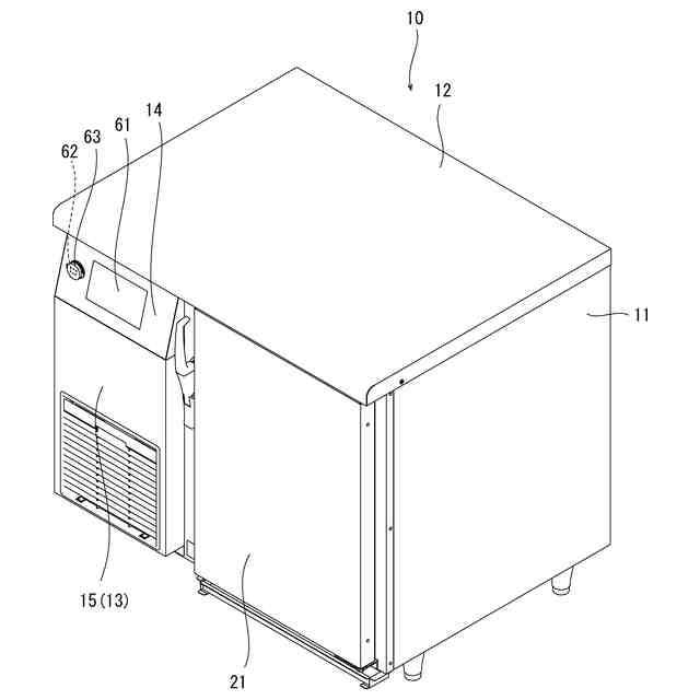 特許文献1の横型冷蔵庫(天板付き機器)においては、冷凍装置の冷媒を循環させることにより、冷蔵室内は冷媒が冷却器で蒸発することにより冷却されている。特開2023-83560に公開されている縦型の冷蔵庫は、USBケーブル等の通信ケーブルで端末と接続可能としており、端末から所定の機能の設定内容情報を受信可能としている。特許文献1の横型冷蔵庫でも特開2023-83560の縦型の冷蔵庫と同様にUSBケーブル等の通信ケーブルで端末と接続可能としたときには、端末から所定の機能の設定内容情報を受信可能にすることができる。特許文献1の横型冷蔵庫でUSBケーブルを接続するときに、USBケーブルを接続しやすい位置にUSBのコネクタ(信号端子部)を配置する必要がある。
