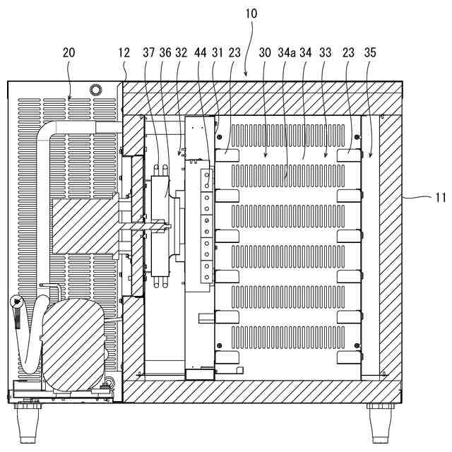 特許文献1には、天板を調理台として使用可能な横型冷蔵庫の発明が開示されている。この横型冷蔵庫は、厨房等の調理施設に設置可能なものであり、天板が調理をするための調理台(作業台)として利用可能である。横型冷蔵庫は、断熱箱体内に冷蔵室と、断熱箱体の左側に機械室とを備え、断熱箱体内の冷蔵室には冷凍装置の冷却器が配設され、機械室内には冷凍装置の蒸発器以外の構成部品として圧縮機、凝縮器及びキャピラリーチューブが配設されている。横型冷蔵庫においては、冷凍装置の冷媒を循環させることにより、冷蔵室内は冷媒が冷却器で蒸発することにより冷却されている。