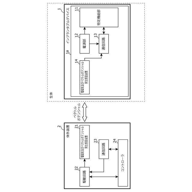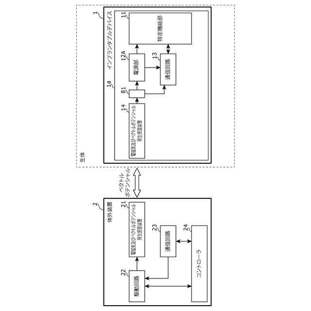 【解決手段】 当該インプランタブルデバイスシステムでは、体外装置2は、電磁気及びベクトルポテンシャル発生感受装置21を備え、インプランタブルデバイス1は、電磁気及びベクトルポテンシャル発生感受装置21により発生したベクトルポテンシャルを感受する電磁気及びベクトルポテンシャル発生感受装置14を備える。そして、体外装置2は、送信データを示す変調信号を生成する通信回路23と、その変調信号に基づいてベクトルポテンシャルを変調しつつ、電磁気及びベクトルポテンシャル発生感受装置21を駆動して、変調されたベクトルポテンシャルを電磁気及びベクトルポテンシャル発生感受装置21に発生させる駆動回路22とを備える。また、インプランタブルデバイス1は、変調されたベクトルポテンシャルの復調を行って変調信号を抽出し送信データを生成して特定機能部11に出力する通信回路13を備える。