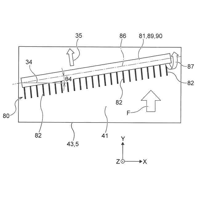 前記軸は、前記搬送方向に対して傾斜して配置される、