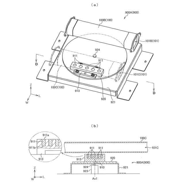 本発明の第三の実施形態の第一変形例に係る停止装置を示す図であり、(a)は模式的斜視図であり、(b)は気流路との関係を示す模式図である。