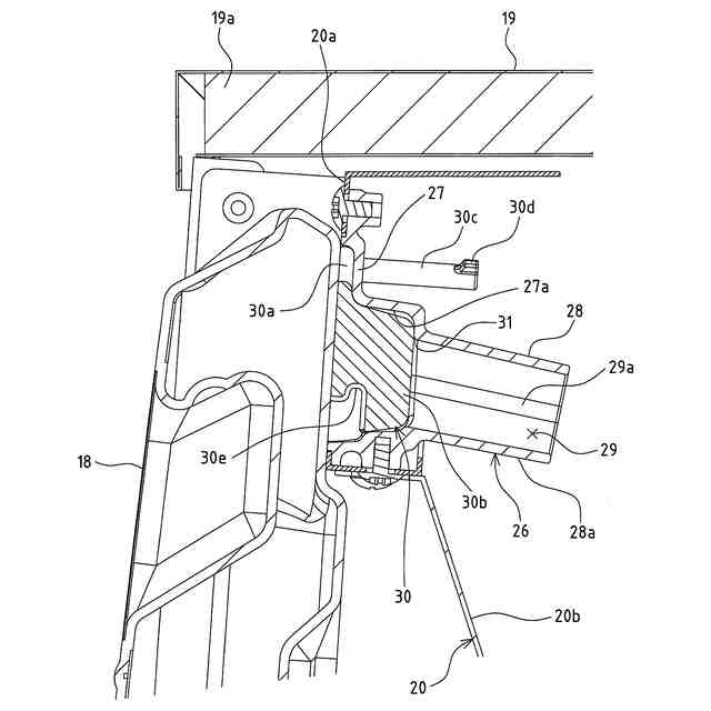 前記製氷水タンクと製氷部との間で製氷水を循環する製氷機では、製氷水として用いる水道水に含まれるカルキやミネラル分などの不純物が、製氷水の循環経路にスケールとして経時的に付着して種々の問題を生ずるため、薬液を用いた定期的な洗浄が行われる。薬液洗浄を行うには、固形状または液状の薬剤を製氷水タンク内に供給する必要がある。また、製氷水供給部は、製氷運転と除氷運転とを繰り返す製氷サイクルにおいて上下方向に傾動するので、外部から製氷水供給部へのアクセスを防止するため、製氷機の箱体における前方に開口する本体には、該本体の開口における製氷水供給部の前方を塞ぐフロントパネルがネジ止め固定されている。従って、製氷機で薬液洗浄を行う場合は、本体からフロントパネルを取り外したもとで、水皿と製氷水タンクとの隙間や水皿上面から、ホース等の供給部材を介して薬剤を製氷水タンク内に供給した後、タンク内の水に薬剤が溶けた薬液を、循環ポンプで循環経路に循環している。しかしながら、本体からフロントパネルを取り外したり取り付ける作業にはドライバー等の工具が必要であり、薬液洗浄に伴うフロントパネルの着脱作業が煩雑であった。また、フロントパネルを取り外しても、製氷機外部から水皿と製氷水タンクとの隙間や水皿上面等に供給部材を臨ませる作業がやり難く、薬剤を供給する際の作業性が低いものであった。そこで、フロントパネルに、前後方向に開口する挿入孔を設け、該挿入孔に前側から挿入した供給部材の後端開口をタンク内に臨ませ、該供給部材を介して製氷水タンクに薬剤を供給し得るように構成することで、フロントパネルを取り外すことなく薬液洗浄を行い得るようにした製氷機が提案されている(例えば、特許文献1参照)。