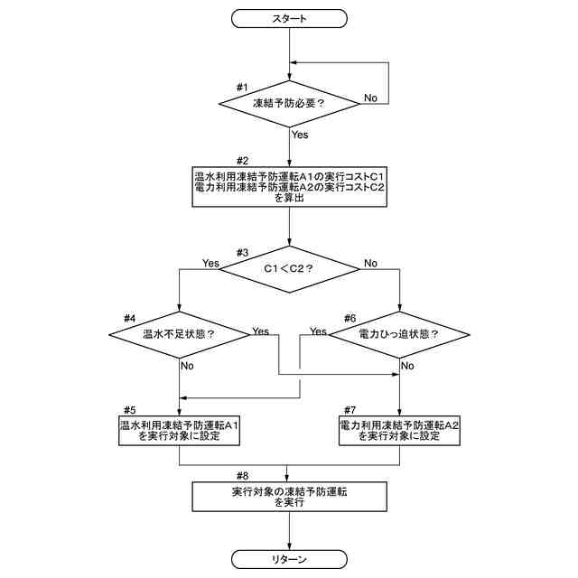 本発明の第2特徴構成は、前記凍結予防運転実行手段が、前記実行対象決定処理において、前記温水利用凍結予防運転及び前記電力利用凍結予防運転の夫々の実行コストを前記消費エネルギの状態として算出し、前記温水利用凍結予防運転と前記電力利用凍結予防運転とのうちの前記実行コストが低い方を実行対象に決定する点にある。