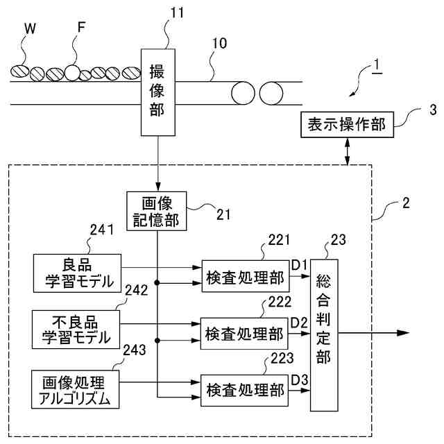 上記[1]の構成によれば、予め想定できる不良品については学習を行うことにより、不良品学習モデルを用いる検査処理部で精度よく不良品であると判定することができ、想定外であり学習されていない不良品については、良品学習モデルを用いる検査処理部で不良品であると判定することができる。このため、検査精度向上を図ることができる。
