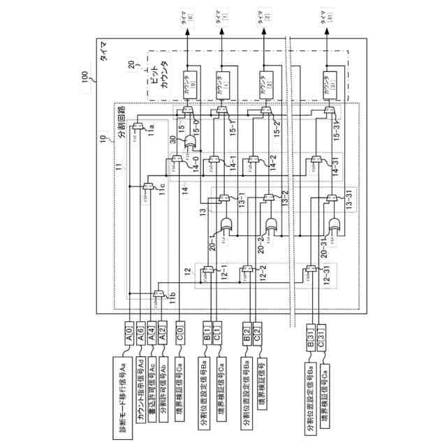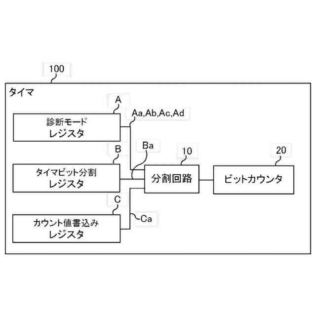 図1は本開示の実施形態にかかるタイマ100の構成図である。タイマ100は、ビットカウンタ20に含まれるビット(bit)を、2以上の任意の数に分割することで、ビットカウンタ20に含まれるビット数を、少なくとも2以上のグループに分け、それらのグループのカウント値を並列にインクリメントするタイマと解釈してよい。タイマ100は、診断モードレジスタA、タイマビット分割レジスタB、カウント値書込みレジスタC、分割回路10、及びビットカウンタ20を備えてよい。