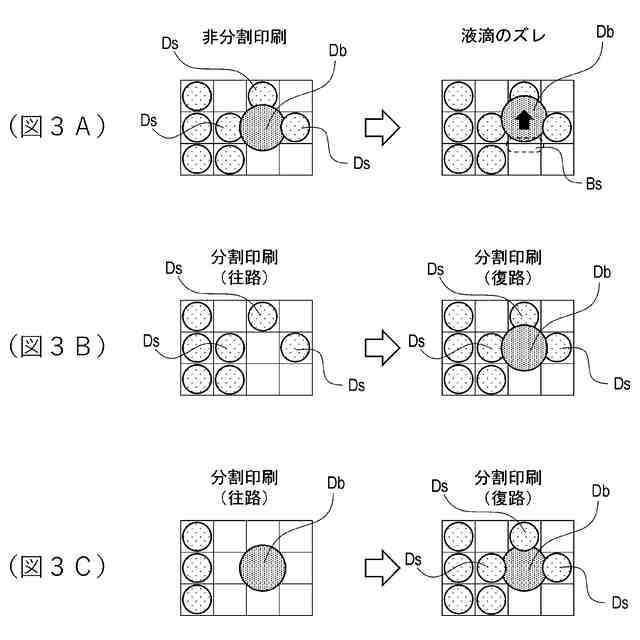 ところで、吐出した液滴を着弾させて被記録媒体上に画像を形成するインクジェットプリンタでは、被記録媒体上で隣接する液滴間の表面張力により液滴の位置ズレが生じうる。液滴の位置ズレが生じると、画像の色の濃度が低下したり、画像表面の粒状性が低下したりする場合がある。これに対し、隣接する液滴を異なる走査(例えば、往路および復路)に分けて吐出すれば、位置ズレの発生を抑制することができる。しかしながら、この場合、印刷時間が長くなるとともに、1つの走査で吐出する場合と2以上の走査に分けて吐出する場合とでは、被記録媒体上での液滴の重なる順序が異なってしまい画像の色味に影響する可能性がある。