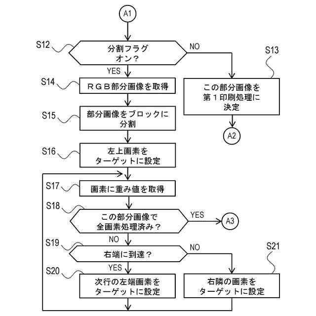 前記フラグがオンの場合に前記第1判断処理において、前記第1画像データを構成する各画素のRGB値に設定された、前記第1印刷処理を実行した場合の画像と前記第2印刷処理を実行した場合の画像との色味の違いの大きさに関する重み値が所定の閾値以上か否かを判断する、