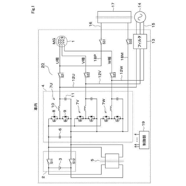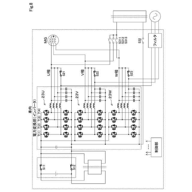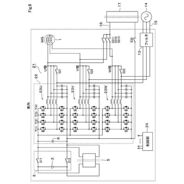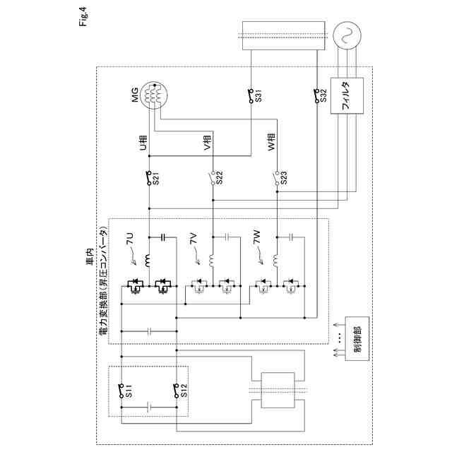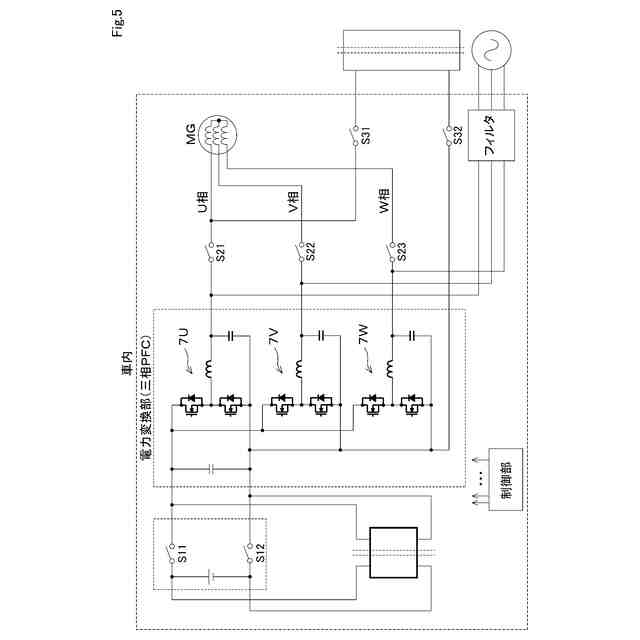 (2)また、交流による普通充電器についても、やはり充電時間を短縮するために高出力が求められ、単相から三相化が進んでいるが、三相PFCコンバータにも同様に、体格が大きくコストが高いという問題がある。(3)さらに、バッテリの電圧が高くなると、モータ/ジェネレータ(以下、MGと記載する)への入力電流リップルが大きくなるため、MGでの損失が増加する。