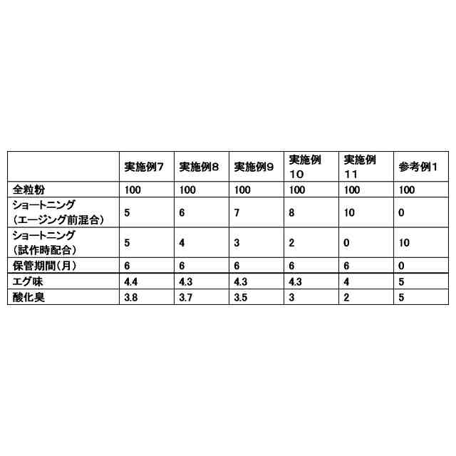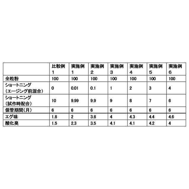 製粉後に一定期間倉庫で保管して熟成させた小麦粉を使用すると、製粉直後の小麦粉と比較して、ケーキ類やカステラ類の品質及び食感が良好になることが知られている。この熟成とは、小麦粉に含まれる酵素活性を低下させリピッドを適度に酸化させて安定した状態にすることで、エージングと呼ばれている。しかしながら、エージング期間が長くなると酸化臭が増すことも知られている。さらに、小麦全粒粉のふすまや胚芽には灰分が多く含まれており、エグ味などの原因となる。小麦外皮部分には酵素が多く存在しており、小麦全粒粉は小麦粉よりも酵素活性が強く、エグ味の原因の一つとなることが知られている。そのため、小麦全粒粉はエージングの影響を受けやすく、酸化臭とエグ味の増加がより顕著である。