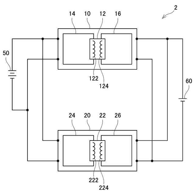 この構成によると、第1DC-DCコンバータと第2DC-DCコンバータでトランスの巻き数比が異なるので、第1DC-DCコンバータにおいて効率良く電圧を変換することができる変圧比と、第2DC-DCコンバータにおいて効率良く電圧を変換することができる変圧比とが異なる。そのため、第1DC-DCコンバータと第2DC-DCコンバータを用いることにより、幅広い範囲の変圧比において効率良く電圧を変換することができる。