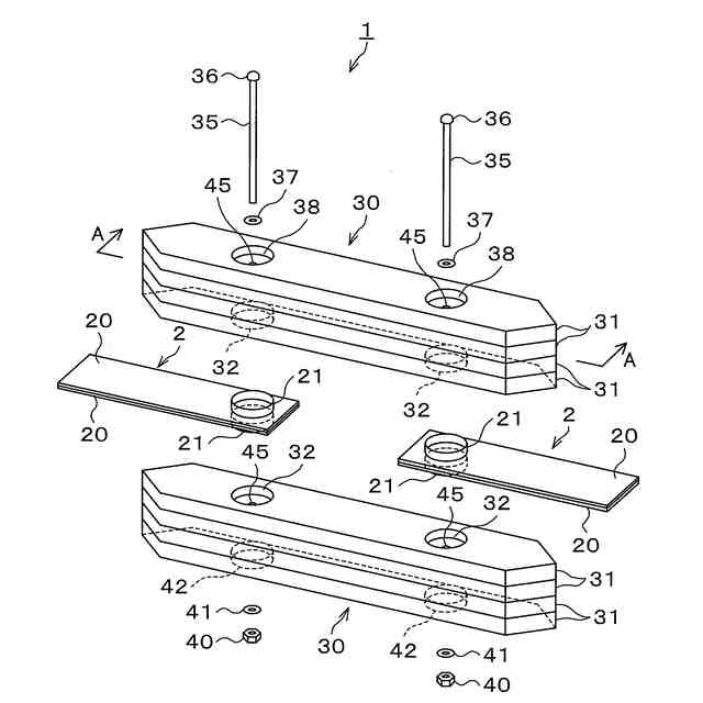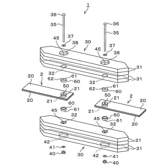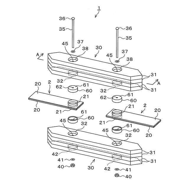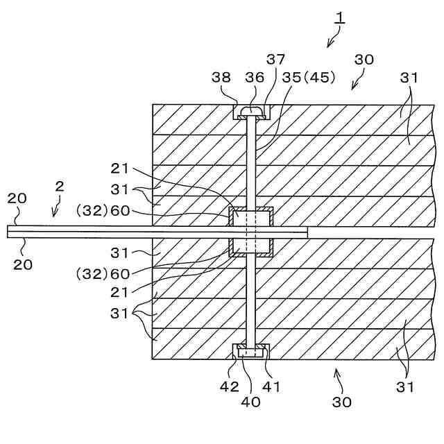 先願技術の構成は、少なくとも1枚の鋼製部材に複数の木製部材又は集成材を締結ボルトで固定し、前記木製部材又は集成材が表面側に配置するようにし、各木製部材又は集成材に、少なくともシア部材を配置する部分の孔を孔軸方向に同内径とした円形の貫通孔を少なくとも1つ設け、その貫通孔に、その内径と同径か僅かに大きくした外径で軸方向全長にわたり同外径としたシア部材を配置すると共に前記鋼製部材に当接配置し、表面側に配置された木製部材又は集成材における前記貫通孔に配置されたシア部材の外側に押え部材が配置され、前記鋼製部材と各シア部材と各押え部材のボルト挿通孔に挿通配置した締結ボルトの締付け力により各シア部材を鋼製部材に圧着して摩擦接合すると共に、前記各押え部材により表面側の木製部材又は集成材のはずれ止めを図るようにしたことを特徴とする木製部材と鋼製部材からなる複合部材である。