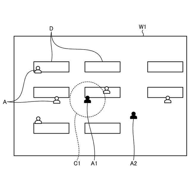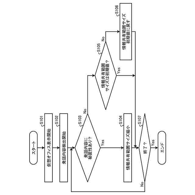 各アバターのユーザは、各々の情報端末装置の画面上に仮想空間を表示させるため、業務内容などによっては、仮想空間を表示する画面を確認していない場合や、確認できない場合が生じる。このような状態において、他のユーザのアバターが近づいてきたことに気付かずに発話を継続すると、発話内容を聞かれることを意図していない他のアバターのユーザに発話を聞かれてしまうおそれがある。