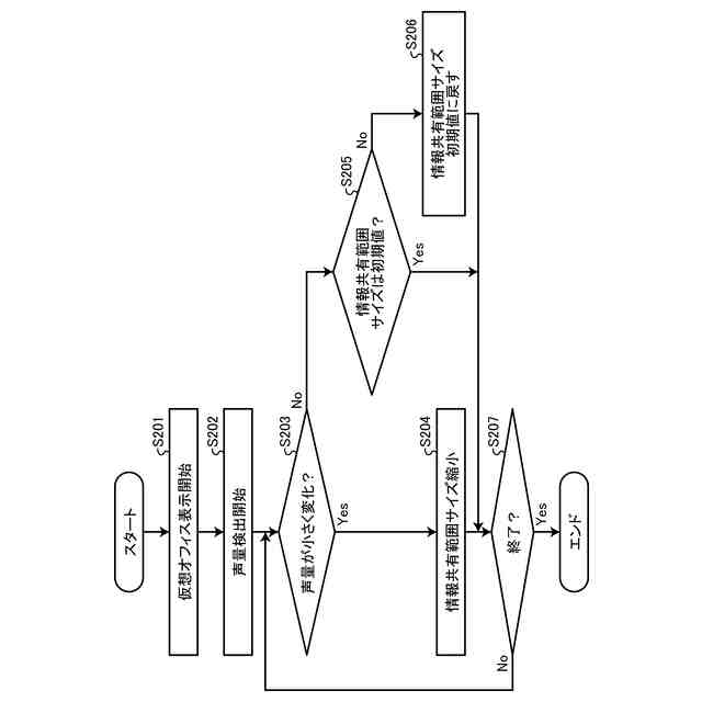 【解決手段】仮想空間制御システム1が備える制御部は、情報端末装置10のユーザの音声を検出し、ユーザの音声の態様に基づいて、情報端末装置10のユーザに対応したアバターの周囲における情報共有範囲の形態を変更する。