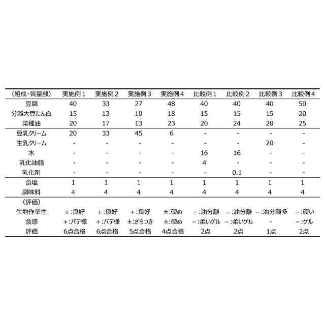 豆乳クリームの生地中配合量は5~50質量%、より好ましくは10~40質量%である。これより少ないと硬すぎたり、弾力が強すぎたりする場合がある。これより多いと適度な食感が得られない場合がある。