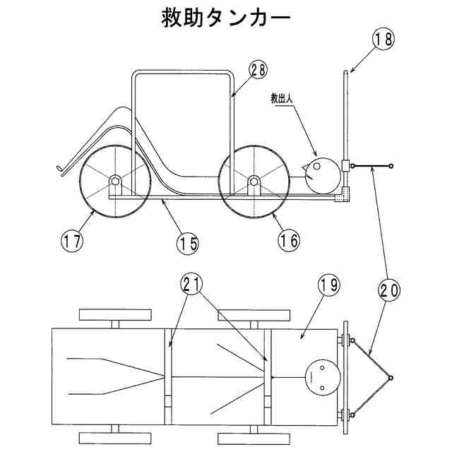 ロープの説明 E図にてロープ7Aの環付きカラビナをタンカー用金具20に連結して、ロープ7Bを操作してタンカーを降ろします。降ろしたらF図のロープ7Dの位置になるまでロープ7Aを引いておきます。ロープ7Cを軽く押さえてロープ7Dを引きます。ロープを巻いた位置10がロープを巻いた位置11の位置に移動して、ロープ7Dの環付きカラビナを次の救助される人のタンカーにつなぐと、次の救出される人を降ろすことができロープを巻き直す必要が無い専用釣り金具です。