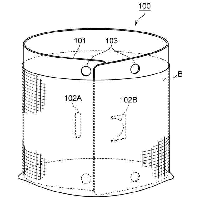 また、例えば特許文献3には、同じく長方形のシートを丸めて筒状にしたものを廃材袋の内部に設置し、その丸められた状態としたシートの復元力で廃材袋の上端を開放させた状態で自立保持を行えるようにした廃材袋用プロテクターが開示されている。
