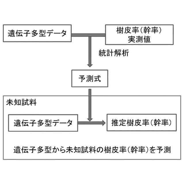 本発明によれば、ゲノム情報をもとに、植物の樹皮率、幹率を事前に把握・予測することができ、用途に応じて樹皮率、幹率の個体を早期に選抜することができる。例えば、樹皮率が低いと予測される個体を選抜し、育種することで樹皮率の低い木材を収穫でき、これを製紙用、燃料用木材チップの原料として用いることにより、生産効率を高めることができる。すなわち、製紙用途では、単位面積当たりのチップ生産性の増加や、剥皮工程のコスト削減が可能となる。燃料用途では、樹皮に多く含まれる灰分や、塩類(例えば、Na、K、Cl)の量を削減でき、ボイラーへの悪影響を低減させることが可能となる。