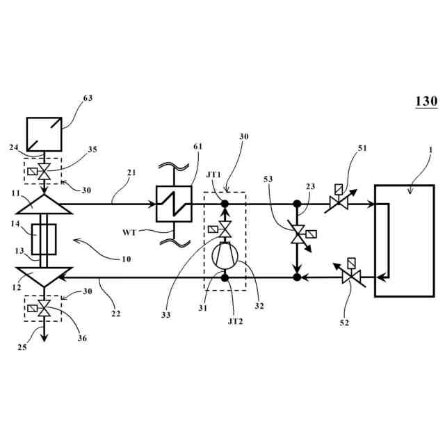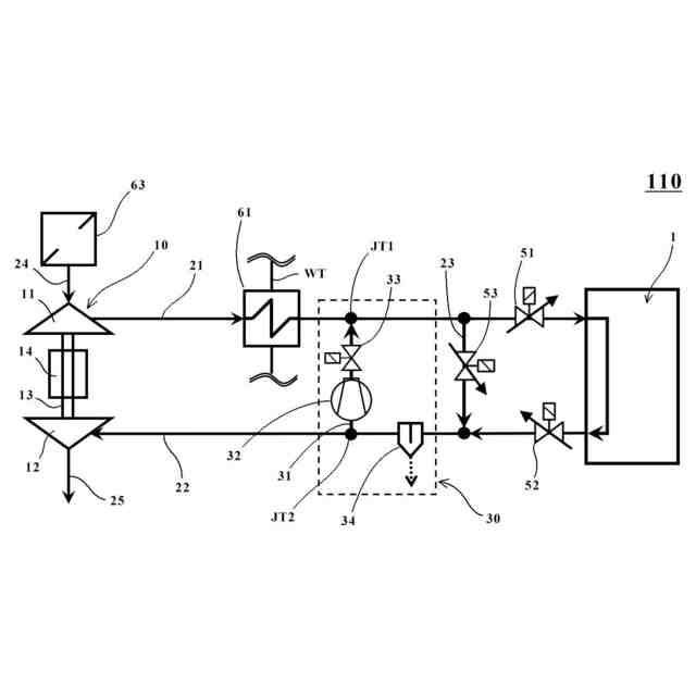 近年では電動ターボチャージャなどの過給機を介して燃料電池に空気(酸素ガス)を供給することも行われている。特許文献1に示されるように、燃料電池へ酸素ガスを供給するカソードガス吸気系は、空気を取り入れる公知のエアフィルタと、このエアフィルタで取り込んだ空気を圧縮する公知の電動ターボチャージャと、この電動ターボチャージャで圧縮されて温度上昇した圧縮空気を冷却する公知のインタークーラなどを含んで構成されている。
