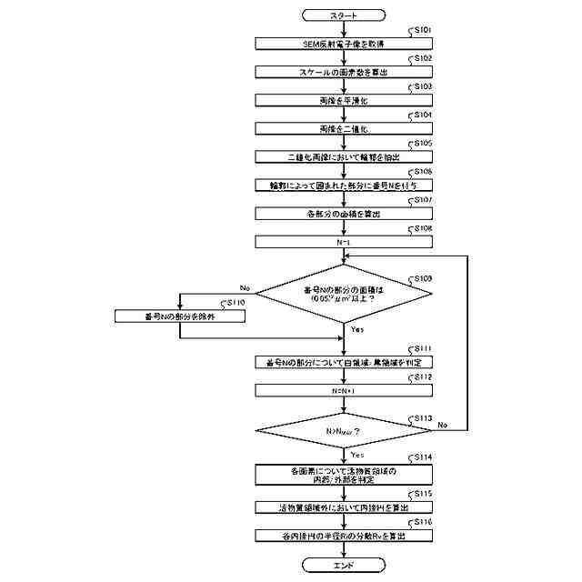 前記画像の各画素が、前記輪郭を参考に判断された正極活物質領域の、内部であるか、外部であるかを判定し、