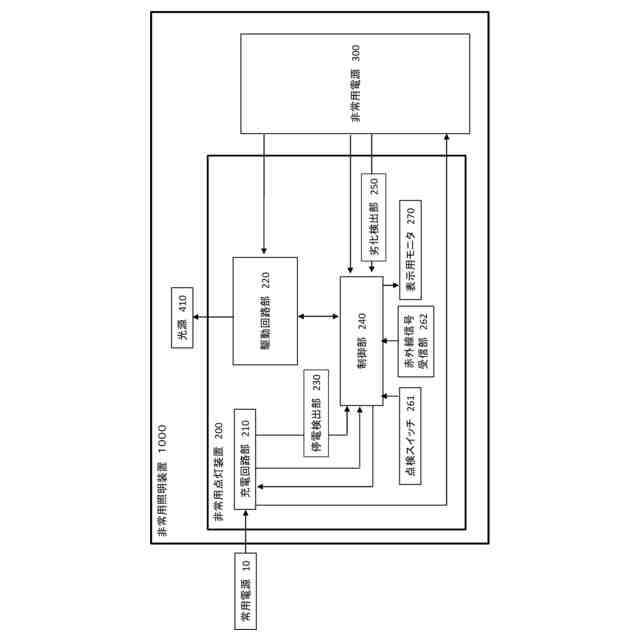 非常用点灯装置200は、商用電源などの外部電源(以下、常用電源10という。)が入力されて非常用電源300を充電する充電回路部210と、充電回路部210に接続された停電検出部230と、充電回路部210及び停電検出部230に接続された制御部240と、非常用電源300から電力供給を受け、制御部240からの制御信号に基づき動作し、光源410に電力を供給する駆動回路部220と、非常用電源300と制御部240の間に設けられた劣化検出部250と、制御部240に接続された点検検出部260及び表示用モニタ270を備える。なお、非常用電源300は、使用によって劣化し交換が必要な部材であるため、後述する点検が必要である。