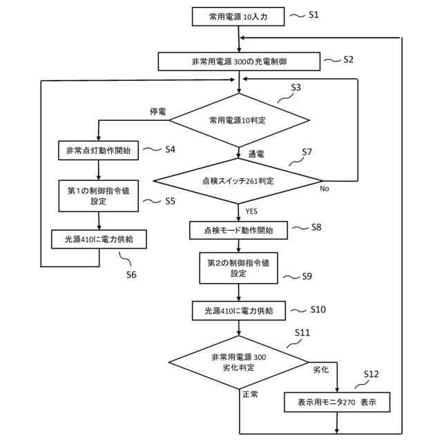 【課題】本開示は、非常用電源10の点検時に光源410の点灯状態が常用時と異なる不便さを解消又は軽減する。